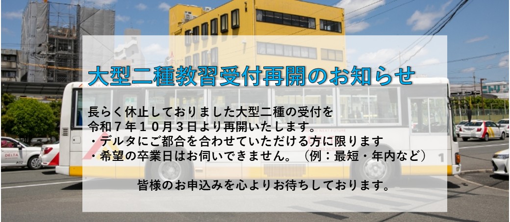 デルタ自動車教習所では、広々とした練習コースで技術上達が早く、経験豊富なインストラクターが丁寧に指導します!また、大型トラックや大型バスなど幅広く免許を取得できるのは京都市内で唯一!無料送迎あり・土日も教習OK!